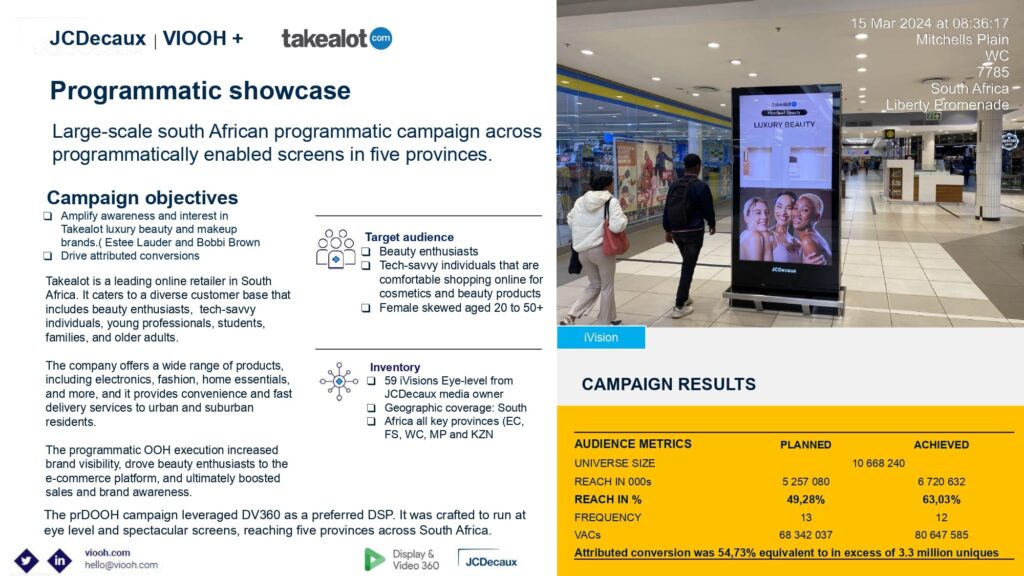 Takealot’s programmatic outdoor campaign for luxury beauty brands across 59 digital screens in five South African provinces achieved 63% reach and a 54.73% attributed conversion rate, driving over 3.3 million unique beauty enthusiasts to their e-commerce platform.